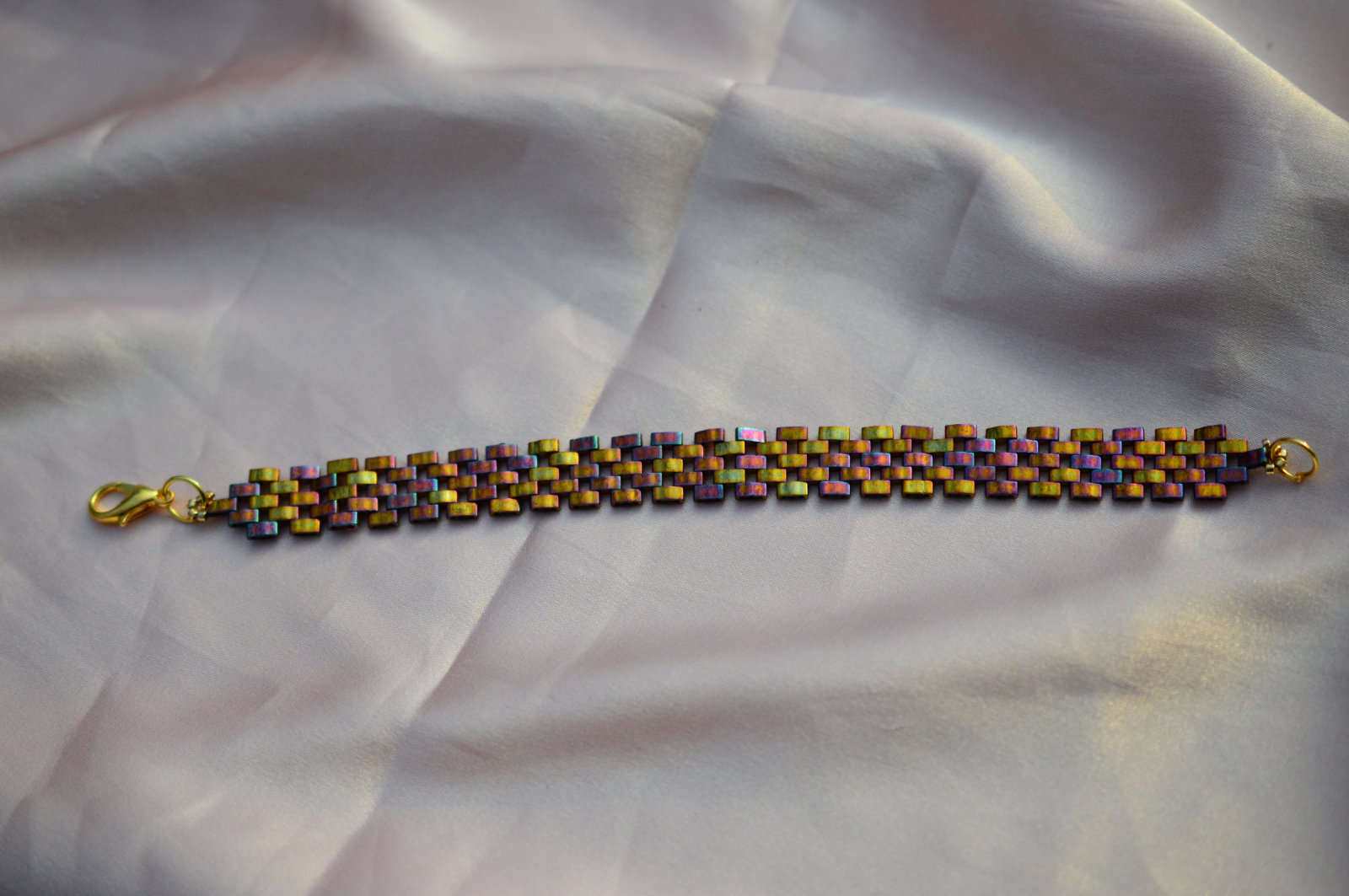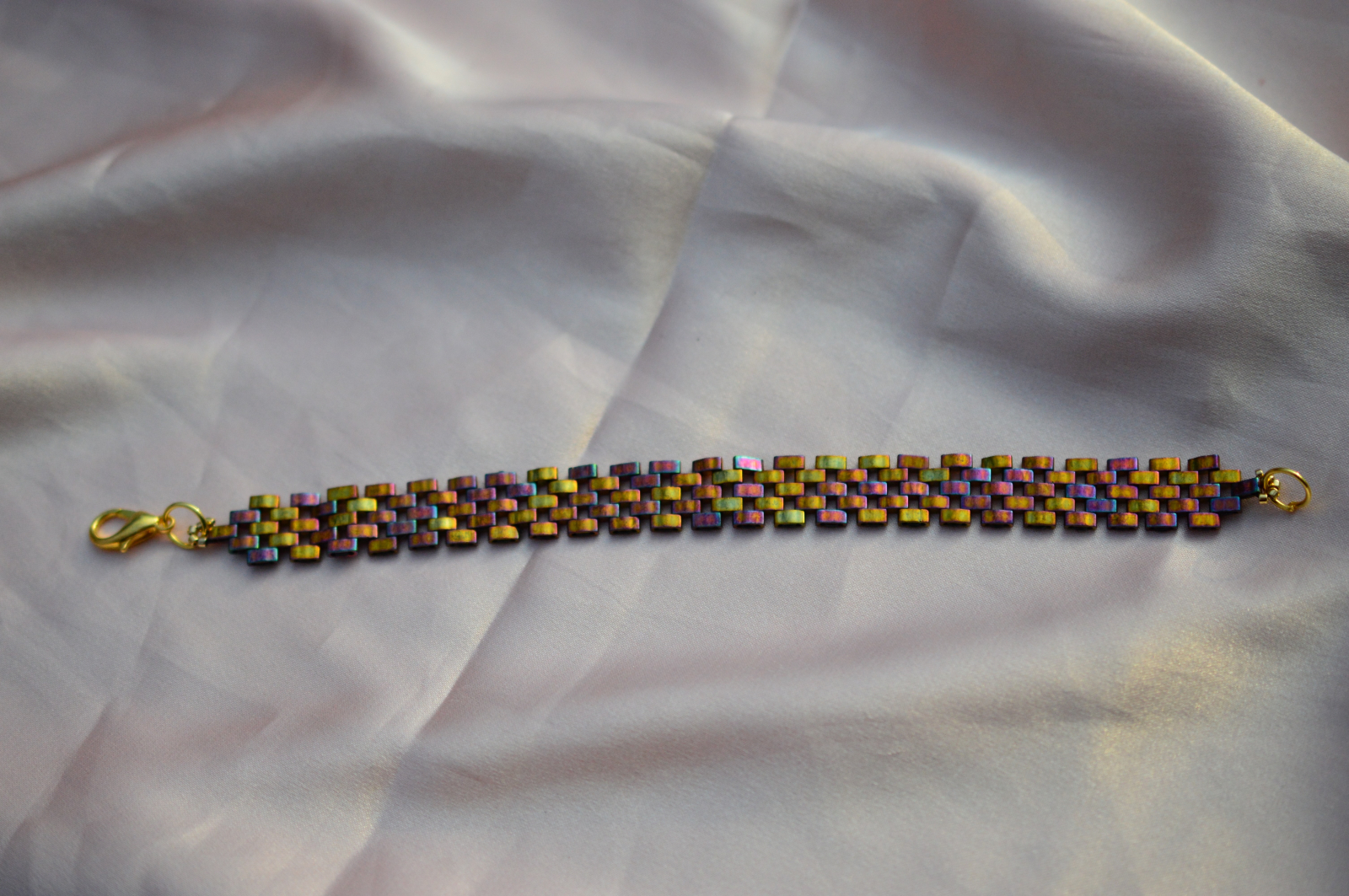 Adauga un plus de rafinament tinutei tale cu bratara Half Tila – Metallic Gold, realizata manual cu margele japoneze Miyuki Delica si Half Tila placate cu aur. Designul geometric si finisajul auriu creeaza o bijuterie moderna si eleganta, potrivita atat pentru tinutele de zi, cat si pentru ocaziile speciale.