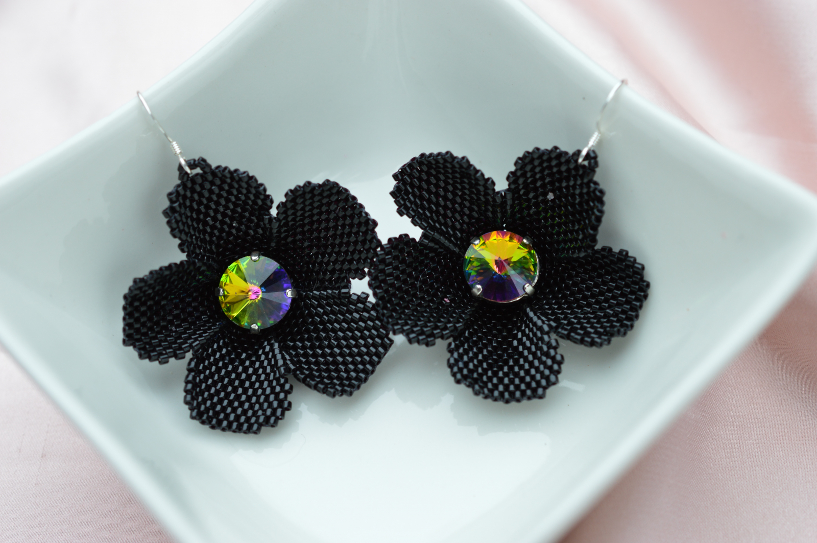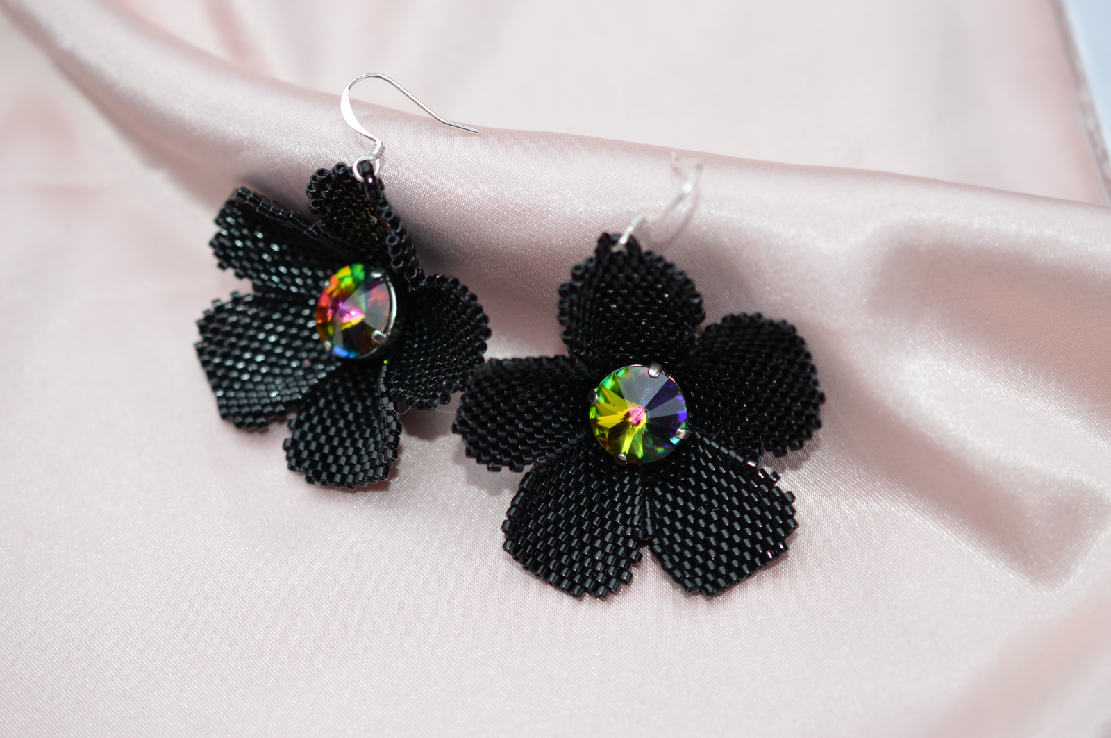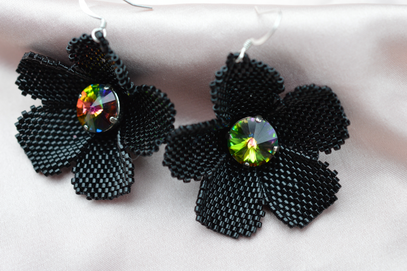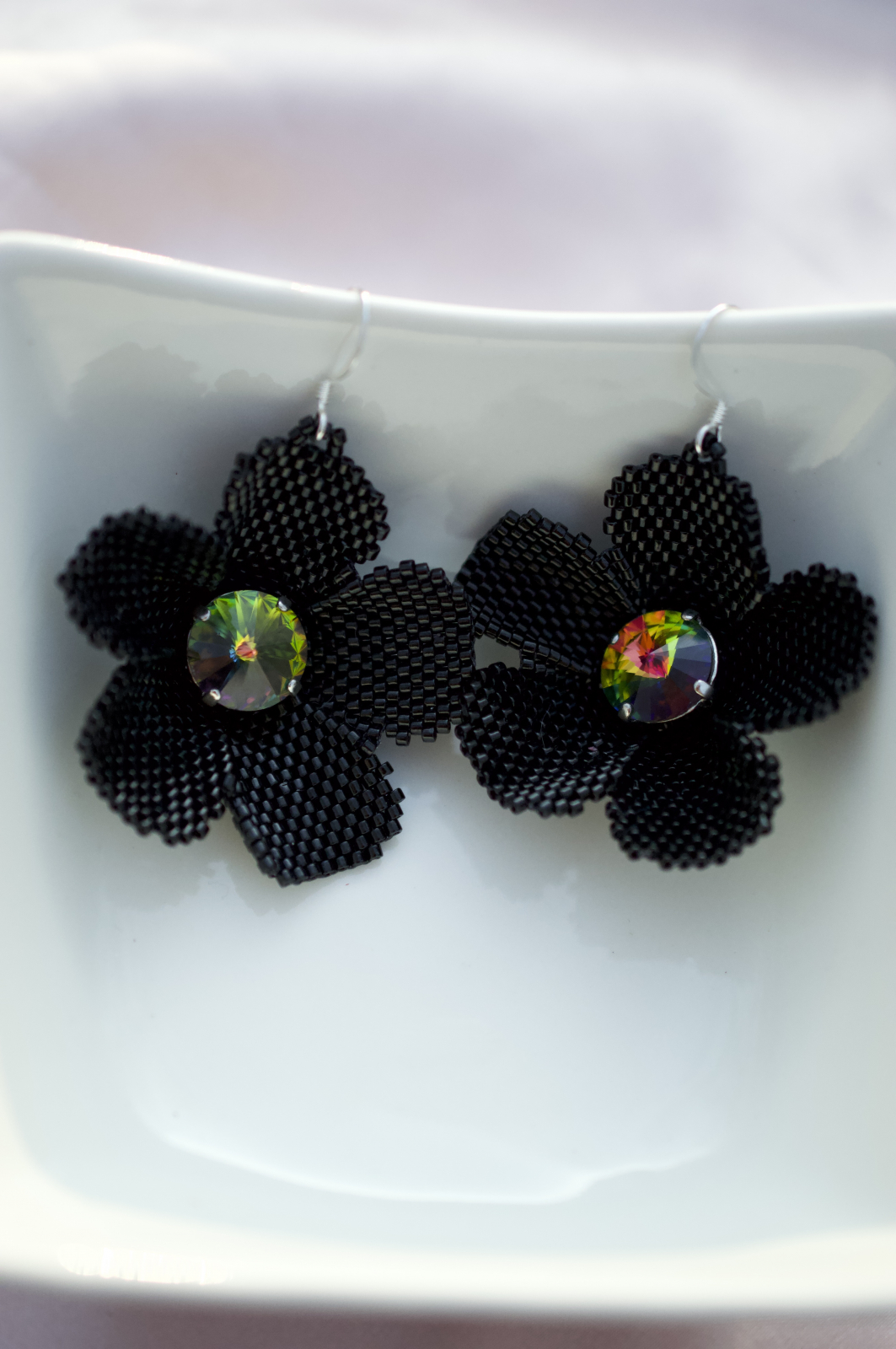 Cercei eleganti cu flori negre, realizati manual din margele Miyuki Delica de inalta calitate si cristale Swarovski in mijloc.
