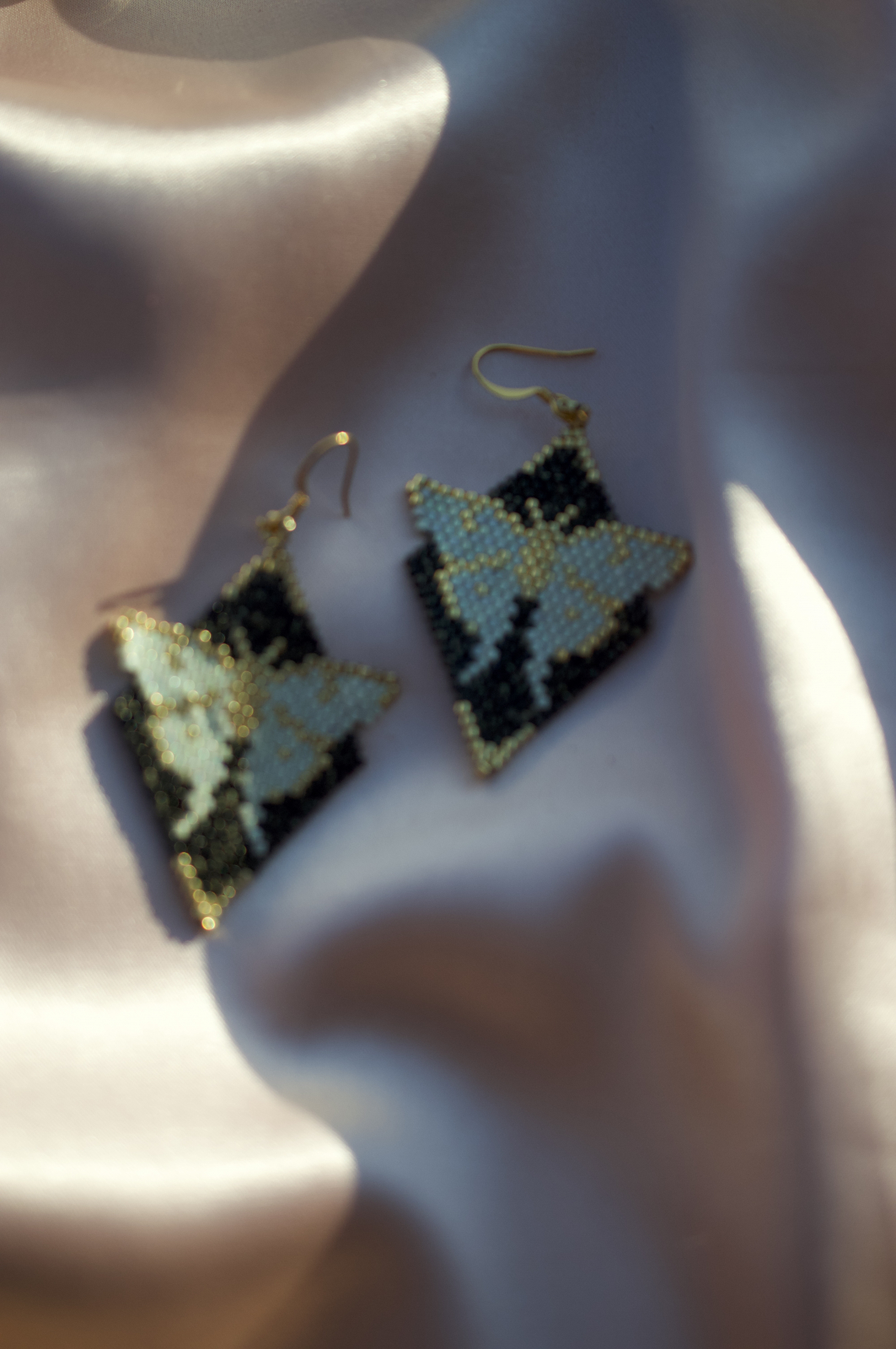 Intr-o armonie perfecta de contraste si simboluri, cerceii Elyra surprind zborul delicat al unui fluture sculptat in margele cu finisaj auriu, turquoise deschis si negru intens. Designul geometric, precis si aerat, aminteste de o poveste in care fragilitatea si puterea danseaza impreuna.
