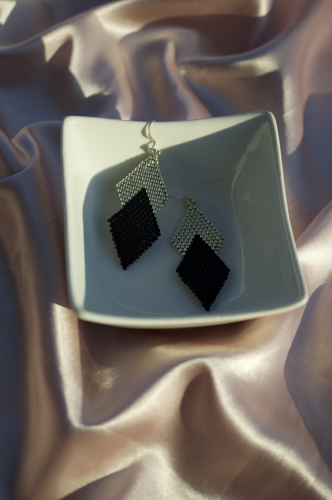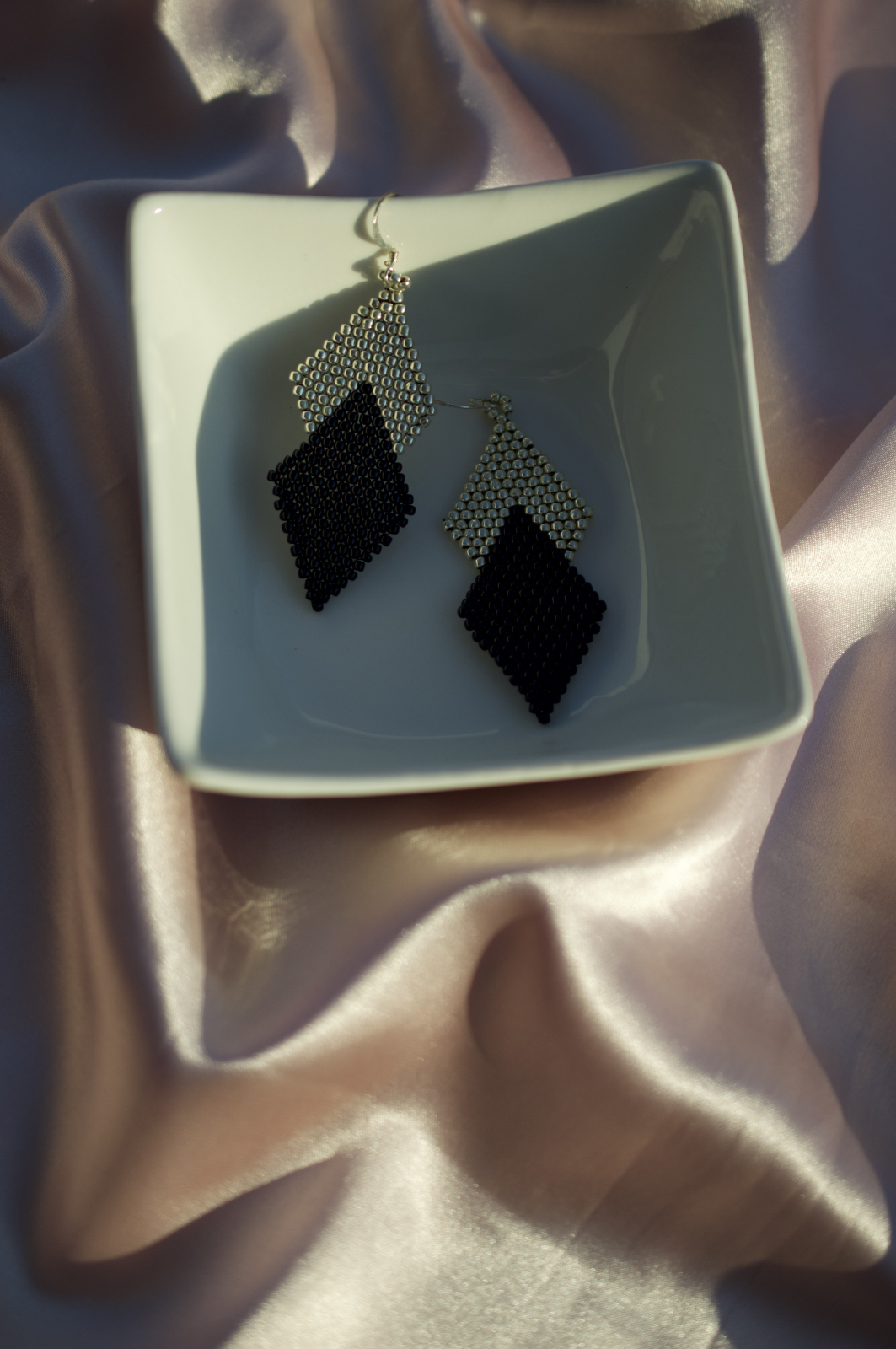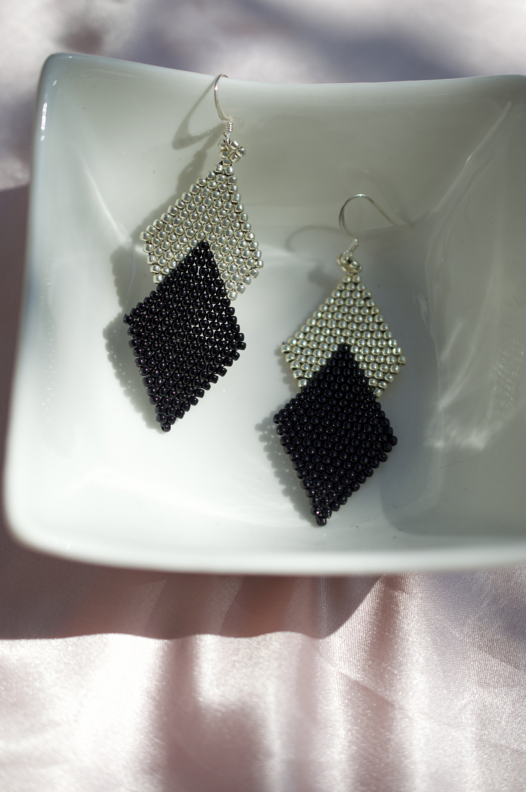 Acesti cercei statement, realizati manual, imbina eleganta si modernitatea printr-un design geometric sofisticat. Doua romburi intrepatrunse, in contrast de culori, creeaza un efect vizual puternic si un stil unic.
