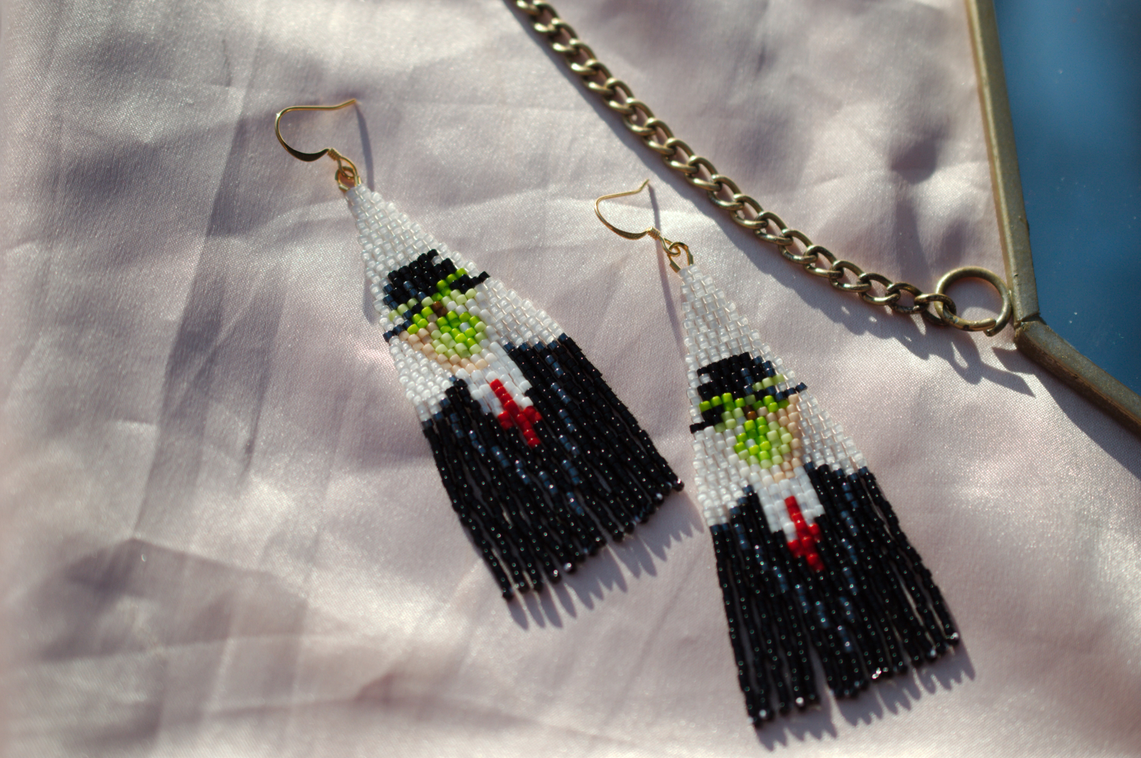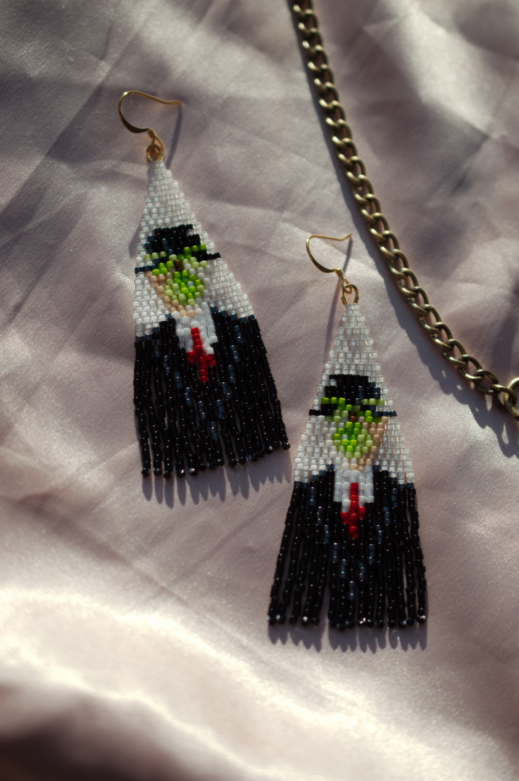 Un accesoriu care combina arta si misterul! Acesti cercei handmade sunt inspirati de celebra pictura "Fiul Omului" a lui René Magritte, un simbol al suprarealismului si al enigmelor vizuale. Lucrati manual cu margele de inalta calitate, acestia redau iconicul personaj cu costum negru, palarie si mar verde, evocand iluzia si simbolismul operei originale. Franjurii adauga miscare si rafinament, facandu-i perfecti pentru un look artistic si sofisticat.