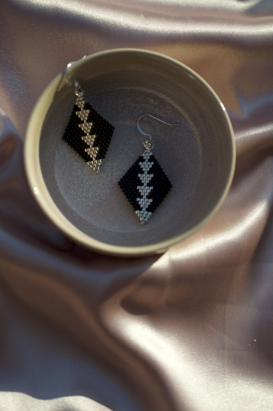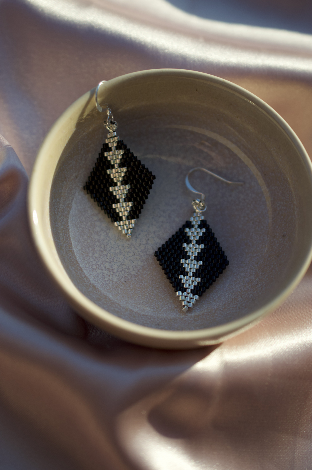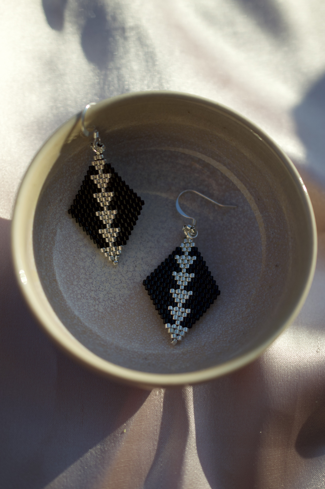 Cercei Monochrome imbina eleganta argintiului cu profunzimea negrului intr-un contrast clasic si sofisticat. Fiecare pereche este realizata manual cu margele Delica de inalta calitate, placate cu argint, si tortite placate cu argint, asigurand confort si rafinament. Designul geometric in forma de romb aduce o nota de modern si mister oricarei tinute.