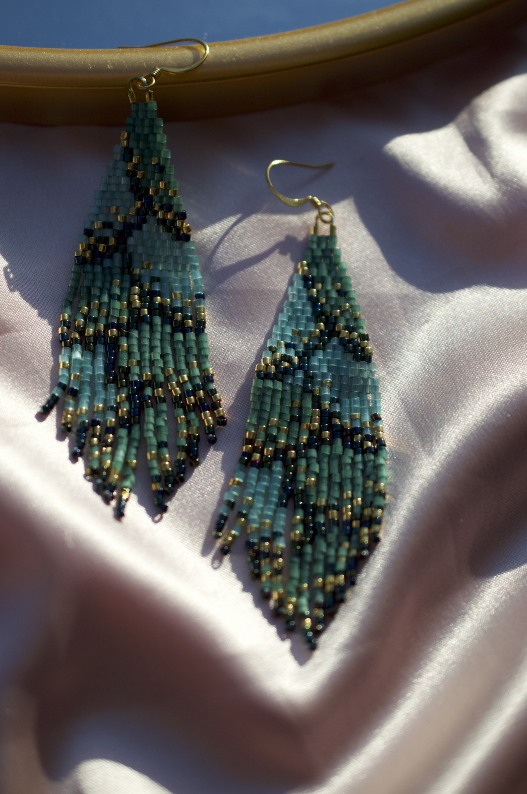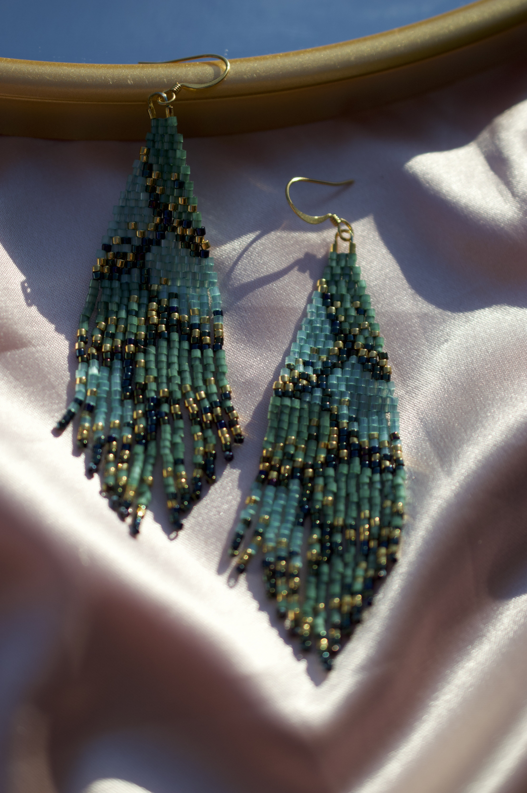 Descopera echilibrul dintre natura si eleganta in cerceii handmade Oceania. Creati manual cu migala din margelute japoneze Miyuki Delica, acest model reda armonia culorilor marine si a valurilor stilizate, imbogatite cu accente aurii.