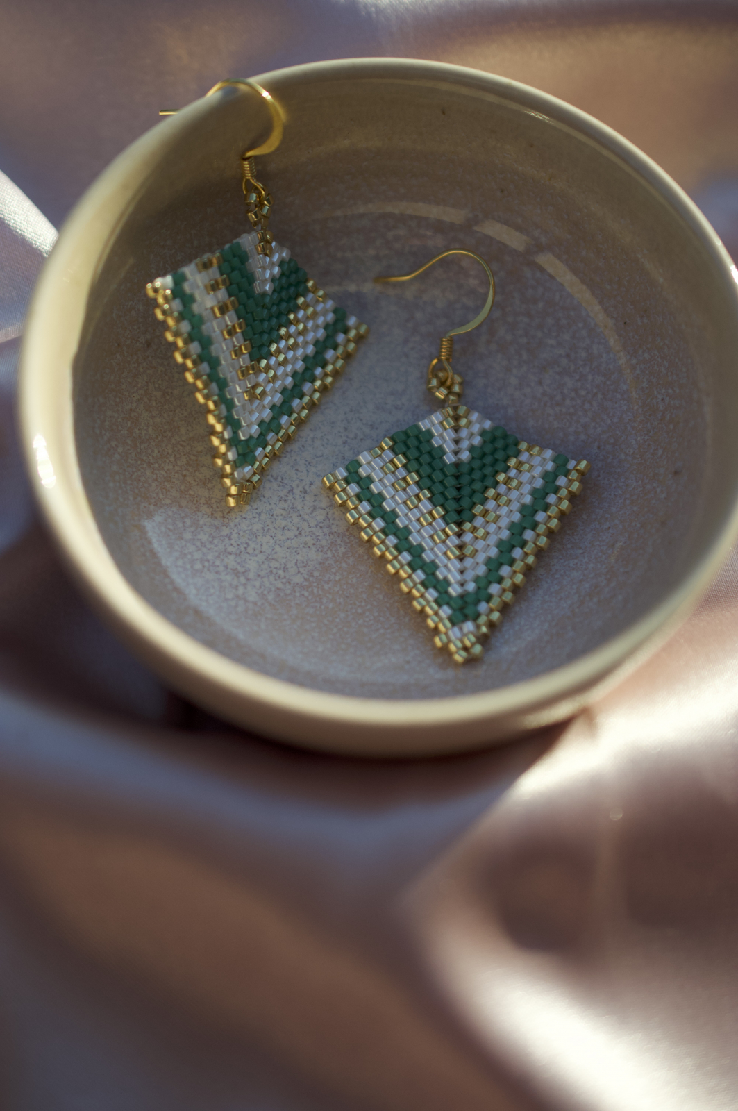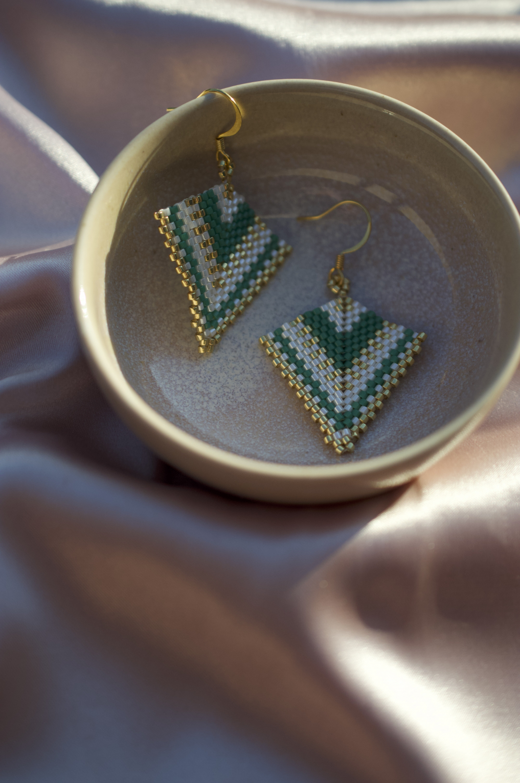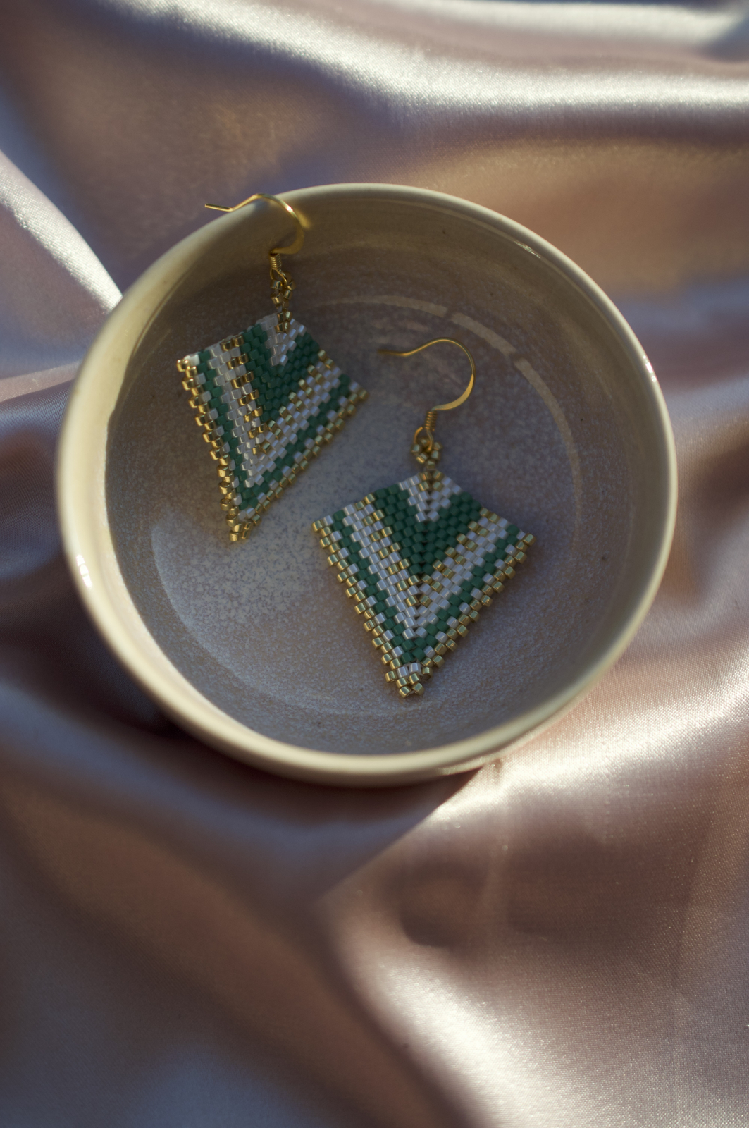 Acesti cercei in forma de romb sunt realizati manual cu margele Delica in nuante de verde smarald, alb si auriu, perfect aliniate intr-un model simetric care atrage privirea. Fiecare margeluta este asezata cu grija pentru a crea un efect optic elegant si modern. Marginea este accentuata cu margele placate cu aur, iar tortitele sunt de asemenea placate cu aur.
