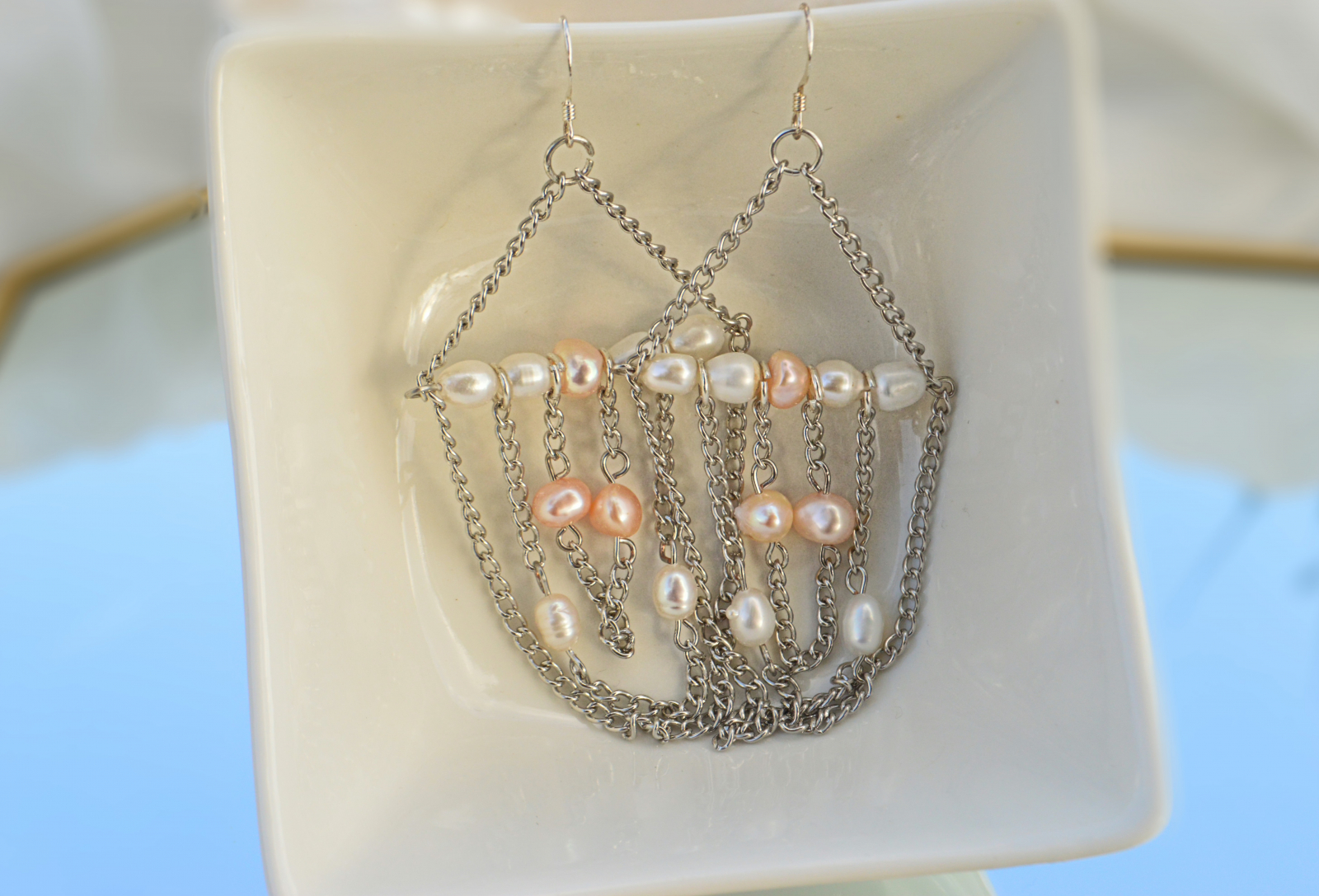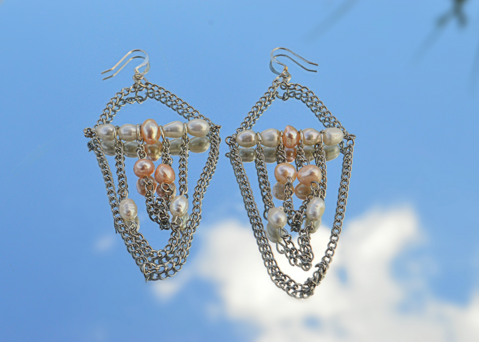 Cercei cu lant matalic si perle de cultura.